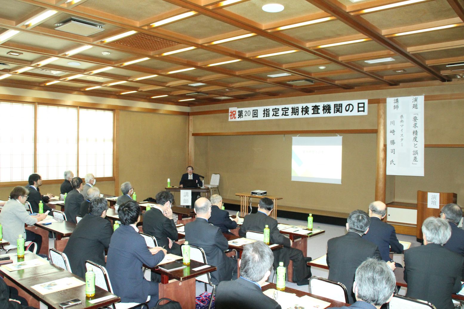20周年記念「指定定期検査機関の日」を開催しました 令和8年3月6日、「指定定期検査機関の日」が、当協会役員、会員、定期検査に従事している検査補助員・受付補助員など35名の出席を得て開催されました。 今回は、指定定期検査機関に指定されて20周年の節目を迎えることから、この間、定期検査の円滑な実施に貢献いただいた11名の方々に、大平会長から感謝状と記念品が授与されました。 また、記念講演として、県央マイスターの川﨑勝司 氏から「要求制度と誤差」と題して講演いただきました。 感謝状を受けられた皆様 記 念 講 演 「指定定期検査機関の日」のページはこちら